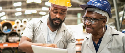 A person and person wearing safety vests and white hard hats